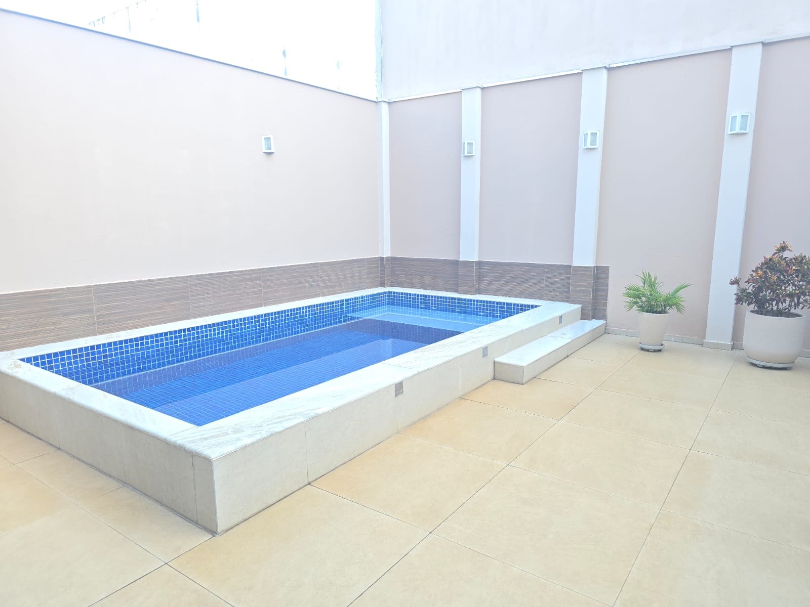 Área de lazer com piscina, banheiro, armário externo e ducha.