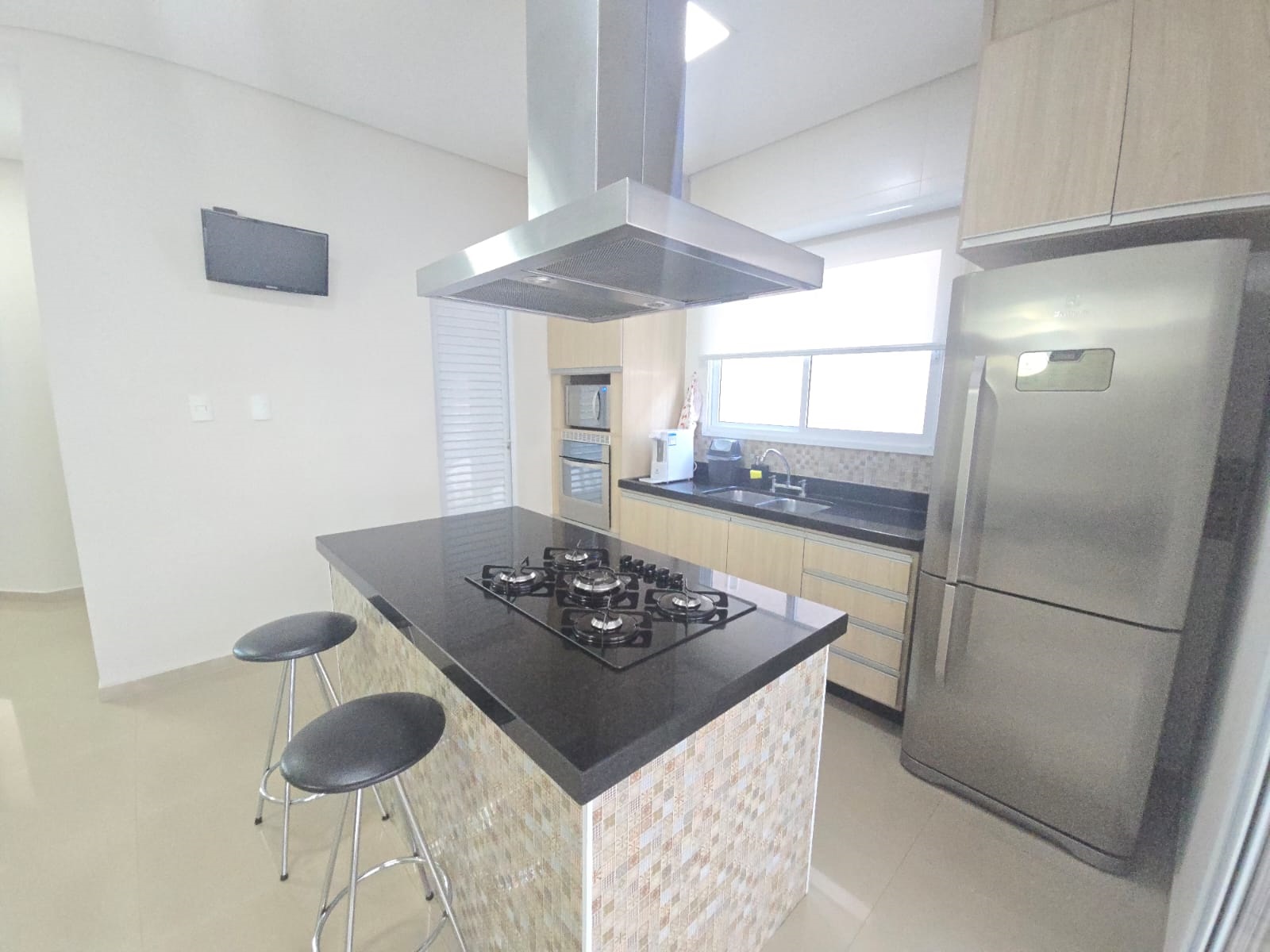Área gourmet com churrasqueira, pia e armário, conectada com a cozinha. Fechada com portas de vidro.